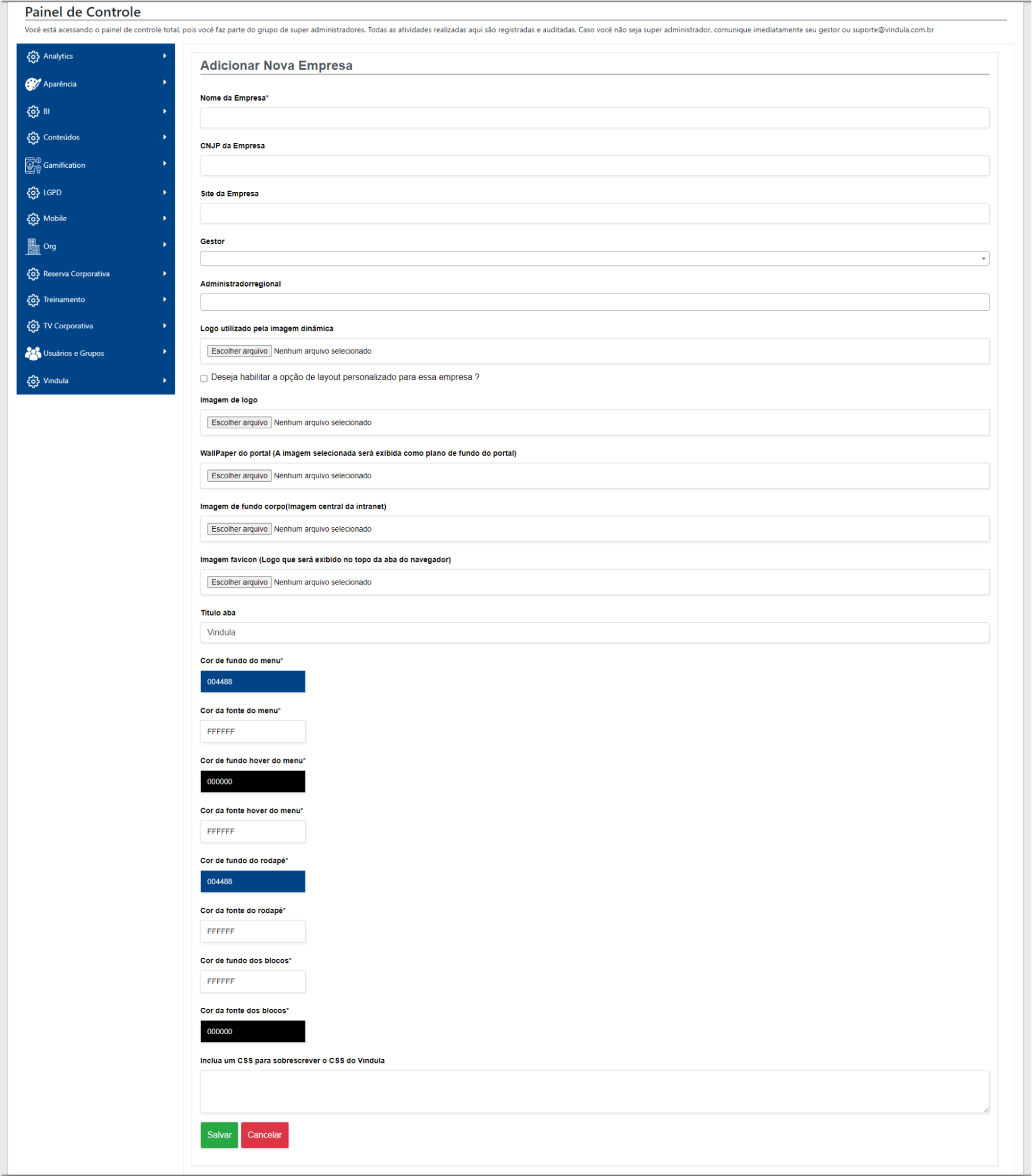 O Vindula te permite aplicar diversas empresas e administrá-las dentro da intranet de forma individual, onde o layout, usuários e as principais funcionalidades funcionem de forma única, desde imagem de logo até a cor da intranet, conteúdo distribuído e entre diversas outras personalizações de funcionalidades.